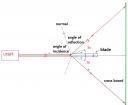 P.S.: The laser line is splited and reflected on the knife edge. The reflected rays draw two lines on the cross board which is calibrated in degrees.