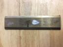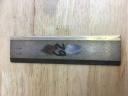 Double edge, .125" thick A2 steel with 15° bevels milled (not ground) on both sides (30° inclusive) and then ground (sharpened) at approximate 15° per side with 180 grit ceramic belt until a burr was formed with subsequent attempt made to remove burr. Then heat treated. This particular sample was hardened to HRC62. Pre heat treat sharpness level 350 - 450 and post heat treat (and some additional deburring) 180/190.