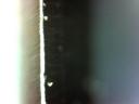 To the best of our information this material is about B50 (not C, B) on the Rockwell. 18 gauge is about .050" thick. We ground a bevel at 19° using 80 grit ceramic and then finished it with 180 grit ceramic. Removing the burr was a nightmare and really not quite certain if we ever did get it all. (After looking at the picture below more closely, I'm pretty certain we didn't). We gave up when we got an edge that measured 275.