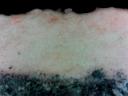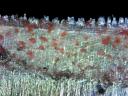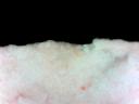 Trigger temperature attainment is indicated by turning Tempilaq from opaque pink to clear. Our first experiment was to only very lightly touch the knife edge on one side ("the grind side") and then inspect to see if the Tempilaq had been triggered on either the "grind side" or the "backside". Of course the abrasive belt would remove the Tempilaq from the grind area on the grind side but we still would be able to inspect immediately adjacent on both sides of the grind area for triggering and then the backside of the edge for same. Here's a micro pic of the center of the grind area after that first touch.