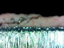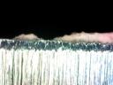 As expected the Tempilaq has been removed from the grind side bevel. You can clearly see opaque Tempilaq still sticking up from the backside however. Next we moved the scope to the side to look at the margins of the grind and still on the grind side. Then a micro pic on the backside of the edge.